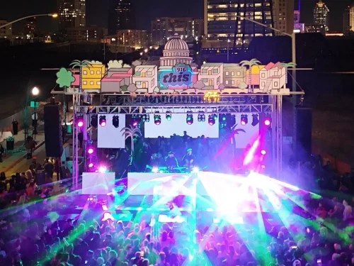 Live sound services with stage, custom scenic decor and lighting for Dia De Los Muertos